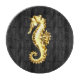 Artistic, polygonal, seahorse of sparkling, gold foil on black background.