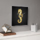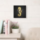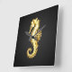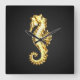 Artistic, polygonal, seahorse of sparkling, gold foil on black background.