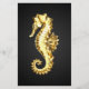 Artistic, polygonal, seahorse of sparkling, gold foil on black background.