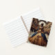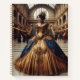 Standing in a vintage grand hall or perhaps a vintage train station, slightly out of place, this Victorian steampunk Gold Lady shines in blue and gold with clockwork gears woven into her elegant fantasy dress on this beautiful notebook for all your inspirations.
