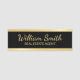 This name tag features name in gold script font style and title in gold sans serif font style on black with gold border background.