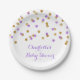 Customisable name girl baby shower party plates in purple gold confetti pattern and elegant hand lettered style text.