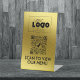 set on a pedestal-style freestanding tabletop sign, this style offers an antique gold simulated metallic background, two designated spaces for graphics, and a textbox at the bottom offering a simple, modern / contemporary sans serif typeface in black. personalise this message to say whatever you would like.