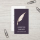 Professional and elegant vertical business card for mobile or public NOTARY AGENT featuring faux gold illustration of a QUILL PEN OR FEATHER PEN with your name and profession over a purple background. Very classy and impressive