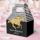 Derby-theme bridal shower gable favour boxes feature a racehorse in faux gold glitter on black and white stripes at the top and black at the bottom with your personal message. MATCHING items in our collection.