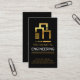 An all black minimalist cover features a set of faux gold lines near the card's centre. The upper gold dotted lines has a gold "home foundation rebar" logo you can use. This is followed by the business name which is broken up into 2 colours, one gold and one white. Just below this is a slogan caption to publicise your services, which you can change. Contact details are located near the base of the card.
