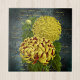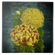 The vintage collage on this decorative ceramic tile features two beautiful chrysanthemums - one a sunny yellow and the other yellow and red - against a distressed teal damask background. The background is a retro collage of gold handwriting, lace, and black rose for an antique feel. The flowers featured on this beautiful tile are from an old public domain botanical illustration. Whether you add this to a fireplace, feature it on a backsplah or countertop, or frame it in a gift box, it can add a beautiful, vintage touch to your home.