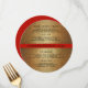 Gold Christmas dinner, or December wedding, round menu template. Round or square, dinner menu has four sections, for hors d'oeuvres, salad, entrées and dessert, with title and area for listing 3 lines of meal selections. Family name can go in the centre over a red strip, or name of couple. Background is glittering gold design only, no real gold or sparkles.