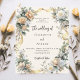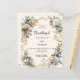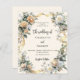 A soft beige, cream coloured background. Decorated with white and yellow florals and a golden ribbon. Personalise and add your names and details.