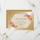 An elegant geometric gold floral wedding save-the-date card featuring pink and orange roses.