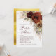 Bridal shower invitation features rustic oil painted burgundy earthy toned autumn fall flowers over greenery and pampas grass with an elegant gold foliage background.