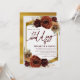 This wedding invitation features rustic oil painted burgundy earthy toned autumn fall flowers over greenery and pampas grass with an elegant gold foliage frame and background.