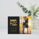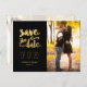 Black and faux printed gold foil modern photo save the date postcard with cute bold script typography. Elke Clarke © Second image on back of card is faint so that text shows.