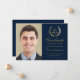 Announce your graduation from law school in style with this elegant custom photo graduation flat card. This classic design template features your photo (3.5x5) to the left and to the right is faux gold scales of justice with laurel wreath and your name, degree, school and date to personalise on a navy blue background. The perfect choice for those graduating from law school. Designed by artist ©Susan Coffey.