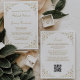 This elegant vintage-inspired formal wedding invitation features the text in gold-coloured script and serif fonts, framed by a delicate vintage gold vine motif. The reverse side provides space for wedding details, along with a QR code guests can scan to visit your website and RSVP, which saves the cost of printing and mailing separate RSVP cards.