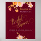 Chic and classy gold calligraphy script welcome bridal shower sign poster with blush peach peonies and gold / white lettering on a dark red burgundy background Please note that the dark red wine background colour is editable. You can change it, as well as the lettering fonts and colour, after selecting "customise further" option.