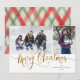 Gold Script "Merry Christmas" in faux glitter with festive tartan pattern backing, 2 photo Christmas card.