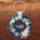 Pretty monogram keychain, featuring a beautiful script name with a complimenting gold initial that is framed by a delicate watercolor floral rose garland on a navy blue background. Personalize to create a special keepsake gift to treasure! Designed by Thisisnotme©