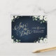 Modern faux gold save the date calligraphy and watercolor white floral eucalyptus greenery on dark navy blue background, elegant and stylish, great for greenery rustic wedding, botanical garden wedding, boho floral wedding in summer and winter.
