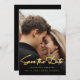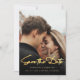 This is a modern wedding save the date card using an elegant calligraphy style font in gold along with a minimalistic photo design.