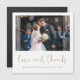 This simply chic photo wedding thank you magnet template features a crisp modern look and a distinctive square shape. We've given this minimalist design a splash of panache with 'love and thanks' below the photo in an elegant gold tone called California Gold in a flowing script in all lower case that lends a warm, familiar accent. This part of the design cannot be altered. You can easily edit the other text not just to show your own details but also suit your taste, picking your favourite colours and fonts. The names and date text are a very dark grey that's in fact mostly black. Use the intuitive design tools, your favourite photo and your inspiration and make it uniquely yours! And please browse our wedding thank you collection a version of this magnet with the 'thank you' script in black as well as other simply chic modern wedding thank you cards in various formats!