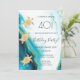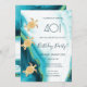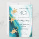 This elegant invitation for a birthday at the beach or beach themed party features gold tribal turtles on a teal blue turquoise ink watercolor background.