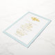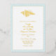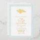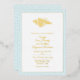 Stylish foil seashore themed wedding invitation, with an aqua wave pattern frame, on the front, with gold seashell and custom gold foil text. Personalise the information for your beach wedding.
