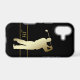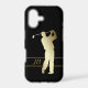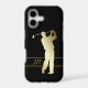 Perfect for the golf fan, this phone case features a gold silhouette golfer in full swing. At the bottom is your monogram framed by thin darker gold lines. The text and image are placed on a black background.
