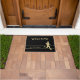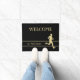 A gold silhouette runner is at the bottom right of this door mat. Thin gold lines frame your family name or other custom text in matching gold, and the top text field, which is also customisable, currently says WELCOME. The image and text are placed on a black background.