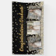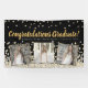 Elegant custom graduation banner design featuring gold and silver confetti over a black background, modern script typography with the words "Congratulations Graduate" (in gold), your name and custom year (in silver) plus three of your favourite photos framed in metallic gold foil.