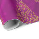 An elegant and luxurious looking pink and gold Christmas wrapping paper. It features a pattern of gold, metallic Christmas trees made of separate golden snowflakes to give it a truly contemporary feel. Each tree has a shining star at the top of it. In the background is a very colourful pink, (faux) silk pattern.