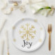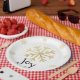 Pretty and chic faux gold snowflakes surrounding “JOY” in green for Christmas. Casual or elegant. Pretty festive plates for all your holiday needs.