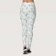 Leggings with a festive holiday repeating pattern of chic gold snowflakes drawn with elegant crystal shapes. A frosty light blue background.