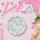 Paper plates with a festive holiday repeating pattern of chic gold snowflakes drawn with elegant crystal shapes. A frosty light blue background.
