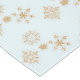 A tablecloth with a festive holiday repeating pattern of chic gold snowflakes drawn with elegant crystal shapes. A frosty light blue background.