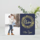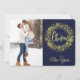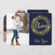 Two of your favorite photographs are the features on this pretty flat Holiday card. The photo on the front is bordered by an image of a sparkling gold snowflake wreath. The stylized text at the center in pale gold says "MERRY CHRISTMAS". Everything is placed on a dark blue background. Your second photograph on the back is bordered with an image of a silver Christmas tree and your own custom text in three easy to change text fields. Elegant!