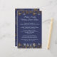 Christmas dinner menu template printed on affordable, flyer paper. Top and bottom border of gold snowflakes over dark blue with light blue text. Create a title, add the year, and list the menu choices for a special holiday feast on Christmas Day or Christmas Eve. Reverse has the same snowflake design covering blue.