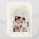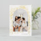 A modern and trend forward arch shaped family photo shines beneath a real foil cascade of glittery dots and star shapes on this simple holiday photo card.