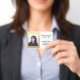 Let others instantly recognise your employees or staff at your facility with this faux gold foil employee photo ID badge. Include information such as the name of the facility, the employee's name, title, and ID number, contact information, logo, etc. Also available in vertical configuration.