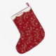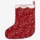 This elegant Christmas stocking features a gold star and swirl pattern against a bright red Holiday background. Your name is in red on the scalloped white top edge which is bordered in gold. Both sides of the stocking have the same image and text. Pretty!