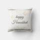 Beautiful throw pillow with Happy Hanukkah in decorative writing.