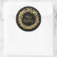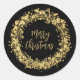 Twinkling gold stars, circles and dots surround the words "Merry Christmas" on black round stickers are perfect for your holiday gift giving and more. MATCHING items in our store.