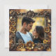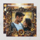 Cool and unique wedding wedding RSVP cards. Steampunk themed with gold metal gears, flowers and a gold bokeh background. Upload your favourite picture in the personalise area and edit the text on the back to add your wedding reception meal choices.