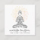 A yoga instructor business card featuring a serene woman in lotus pose surrounded by gold rays of sunlight, with her name in a pretty modern script signature type. Type in the centre of sun rays on the reverse side of the card.