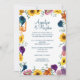 Colourful fall floral mix borders this wedding invitation. Navy blue and plum purple calla lilies, gold sunflowers and pink protea flowers are the perfect bouquet for your fall wedding invitations. Floral border even includes roses and orange tiger lilies. This fall sunflower wedding invitation is versatile for indigo, orange and magenta colour mixes.