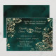 It features an emerald green background with frilly and ornate faux foil gold filigree and chic script lettering.