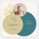 Announce your daughter's baptism with this sophisticated and beautifully designed Square Sticker. Featuring a harmonious blend of muted gold and deep teal, this design radiates elegance and grace. The delicate floral line art adds a subtle touch of nature, perfectly complementing the arched layout. A refined mix of modern serif and script fonts enhances the timeless aesthetic. The personalised photo frame at the top makes this invitation a meaningful keepsake. Ideal for baptisms, christenings, and religious ceremonies, this Square Sticker sets the perfect tone for a heartfelt celebration.