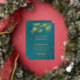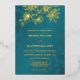 This elegant wedding invitation features gold line art floral cherry blossoms on a shimmering teal / turquoise background.