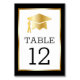 Simple, elegant and modern gold tone grad cap on a white panel with a black background and a gold tone frame with black text table number card design. Coordinating place cards also available via separate purchase. Original design by Holiday Hearts Designs (all rights reserved).