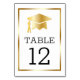Simple, elegant and modern gold tone grad cap on a white panel with a white background and a gold tone frame with black text table number card design. Coordinating place cards also available via separate purchase. Original design by Holiday Hearts Designs (all rights reserved).